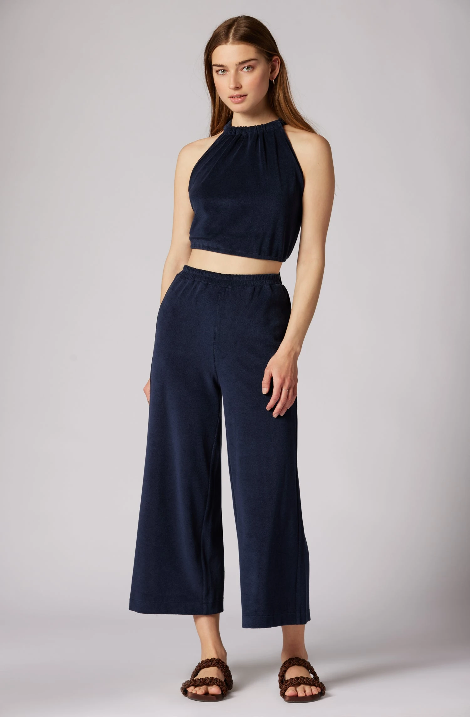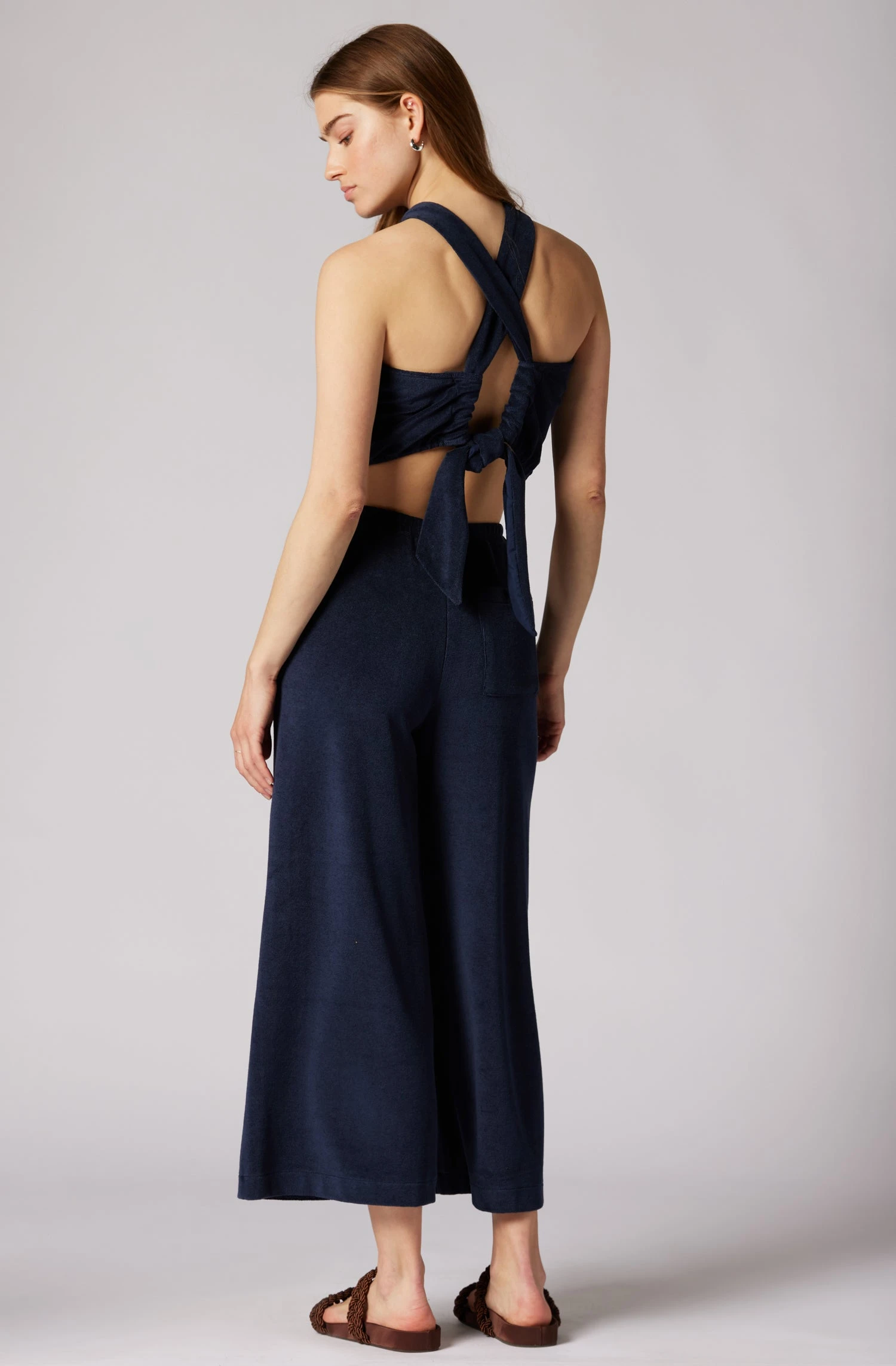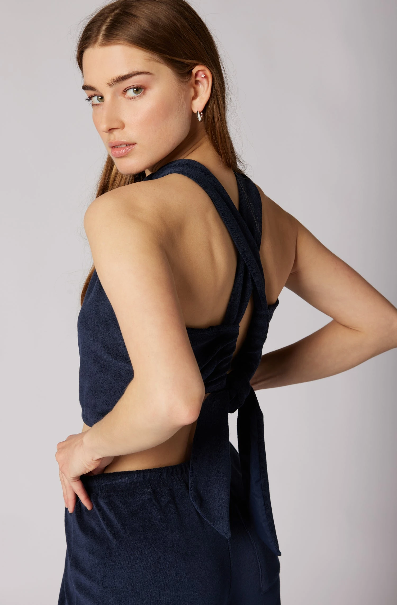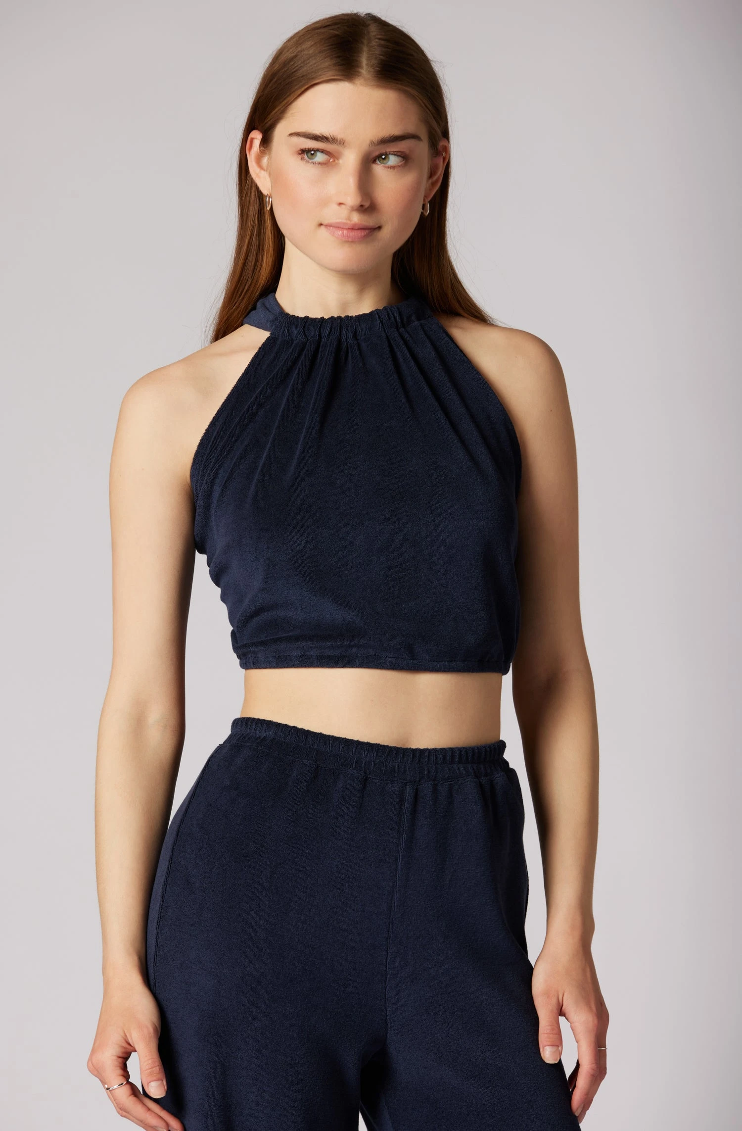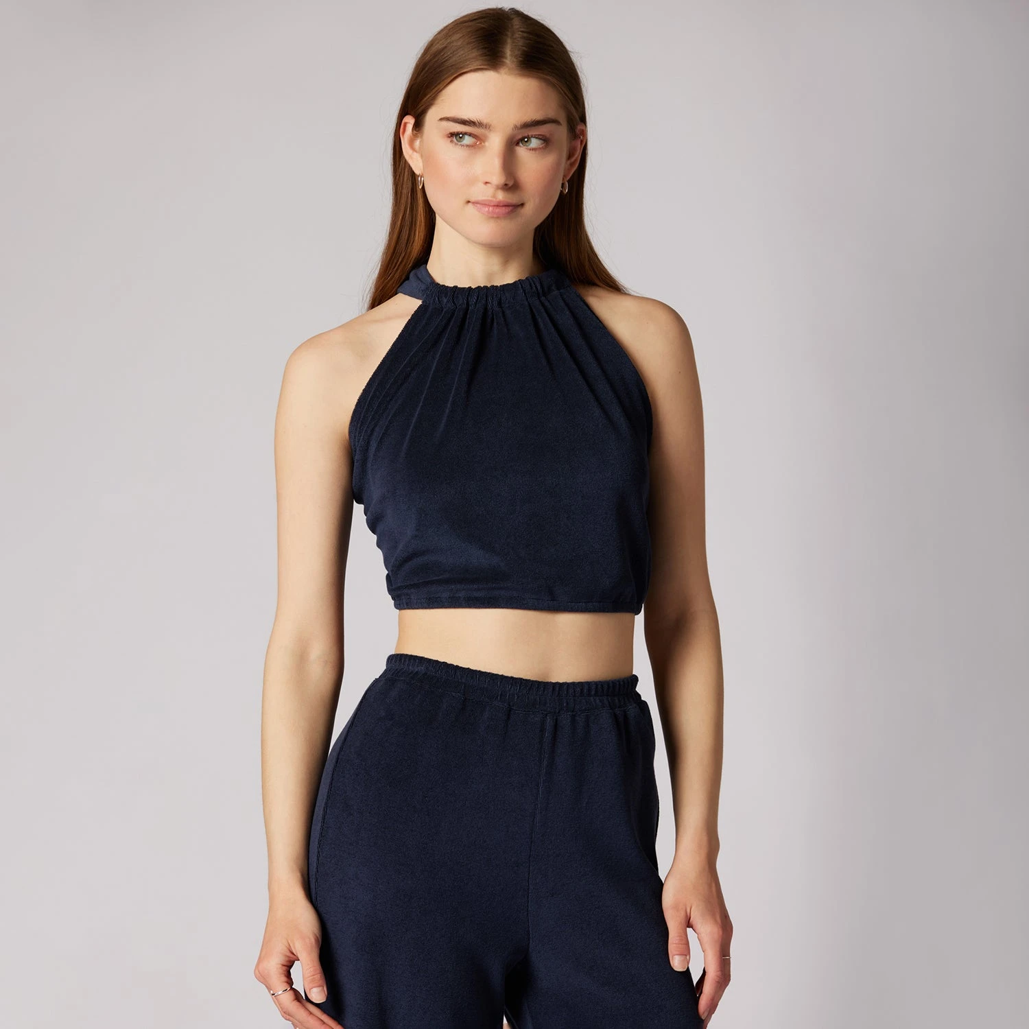 The Anika is the summer terry cloth design you need this season. Cropped, halter neckline, and a tie back strap detail, wear this carefree style with its perfect match The Arden.