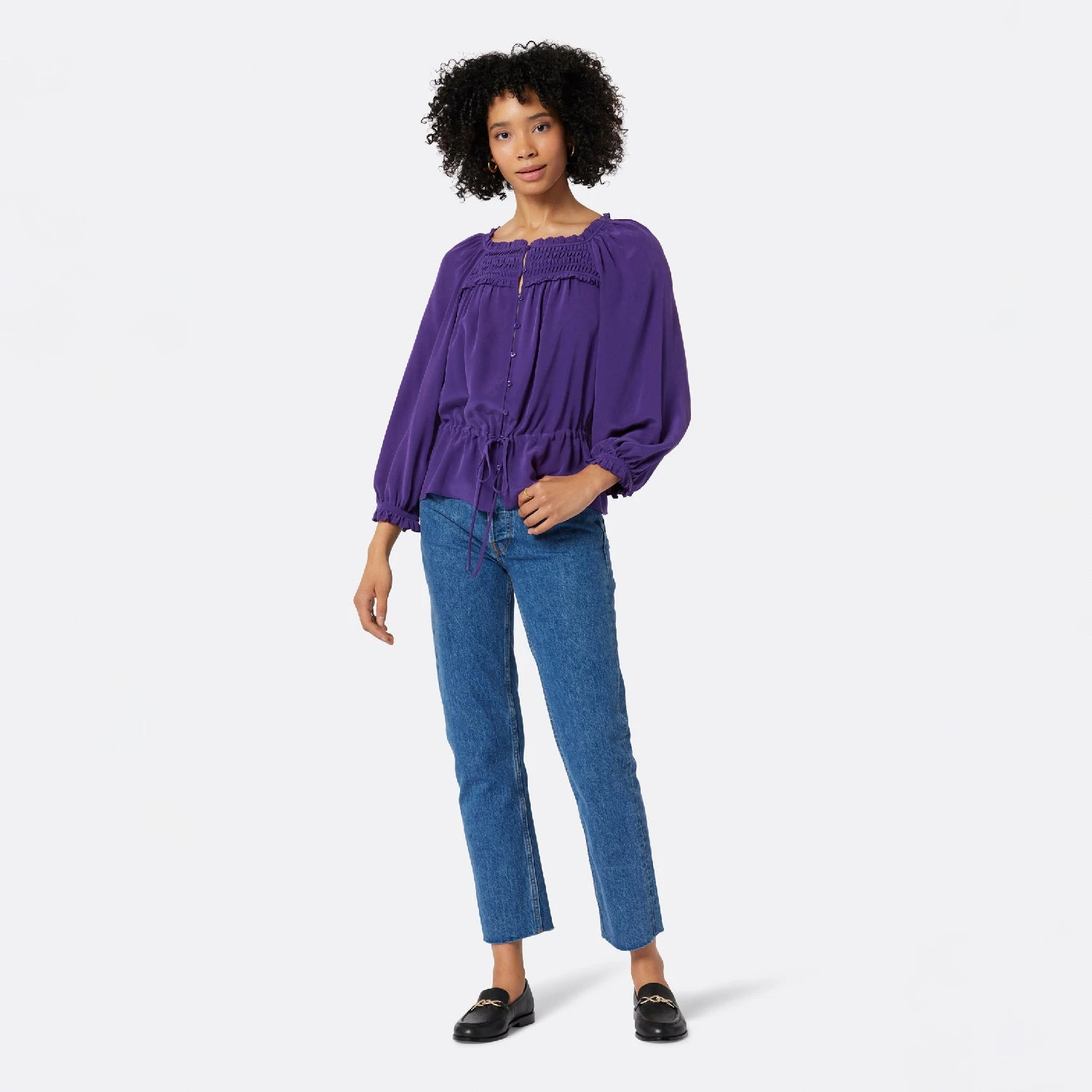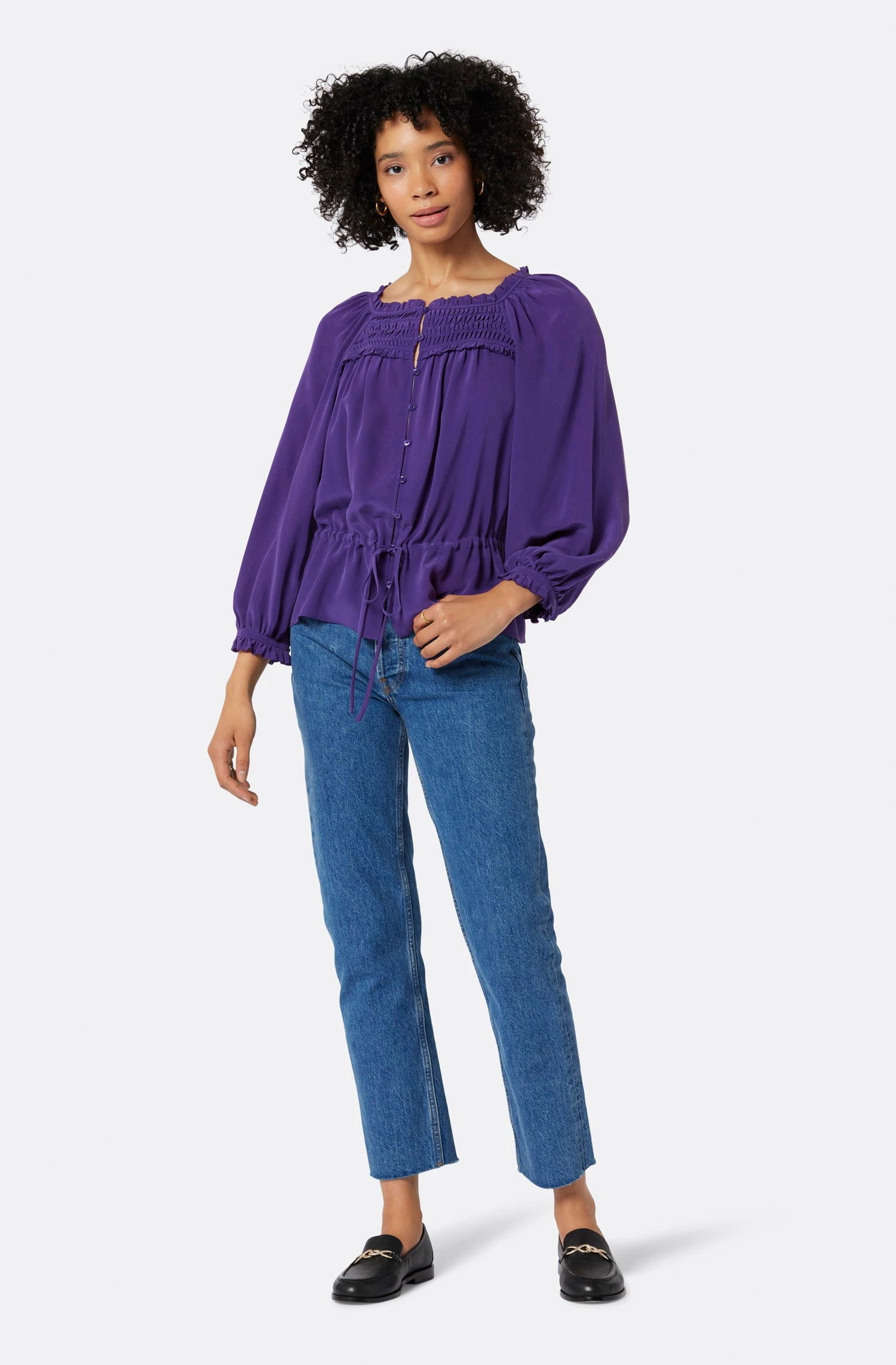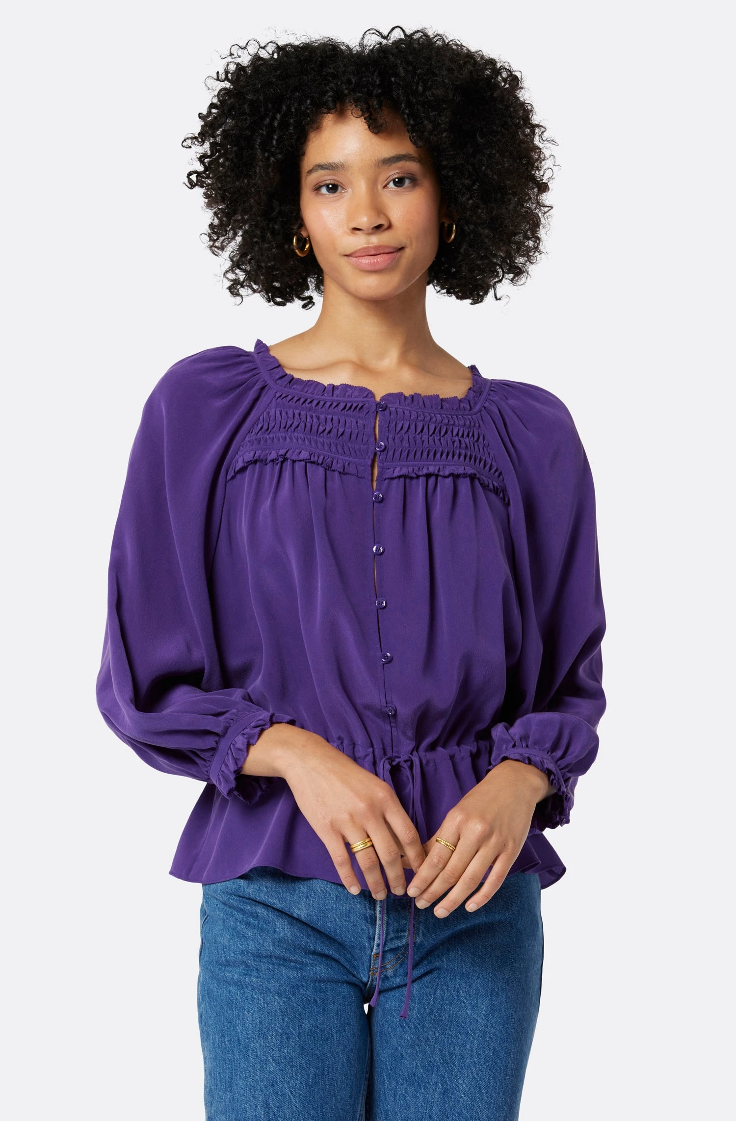 The Asseline is the most lively fall top out there thanks to its fluid shape and rich color. The way this silk design sits on the body also accentuates details like the smocked square neckline, string tie belt, and ruffled cuffs.