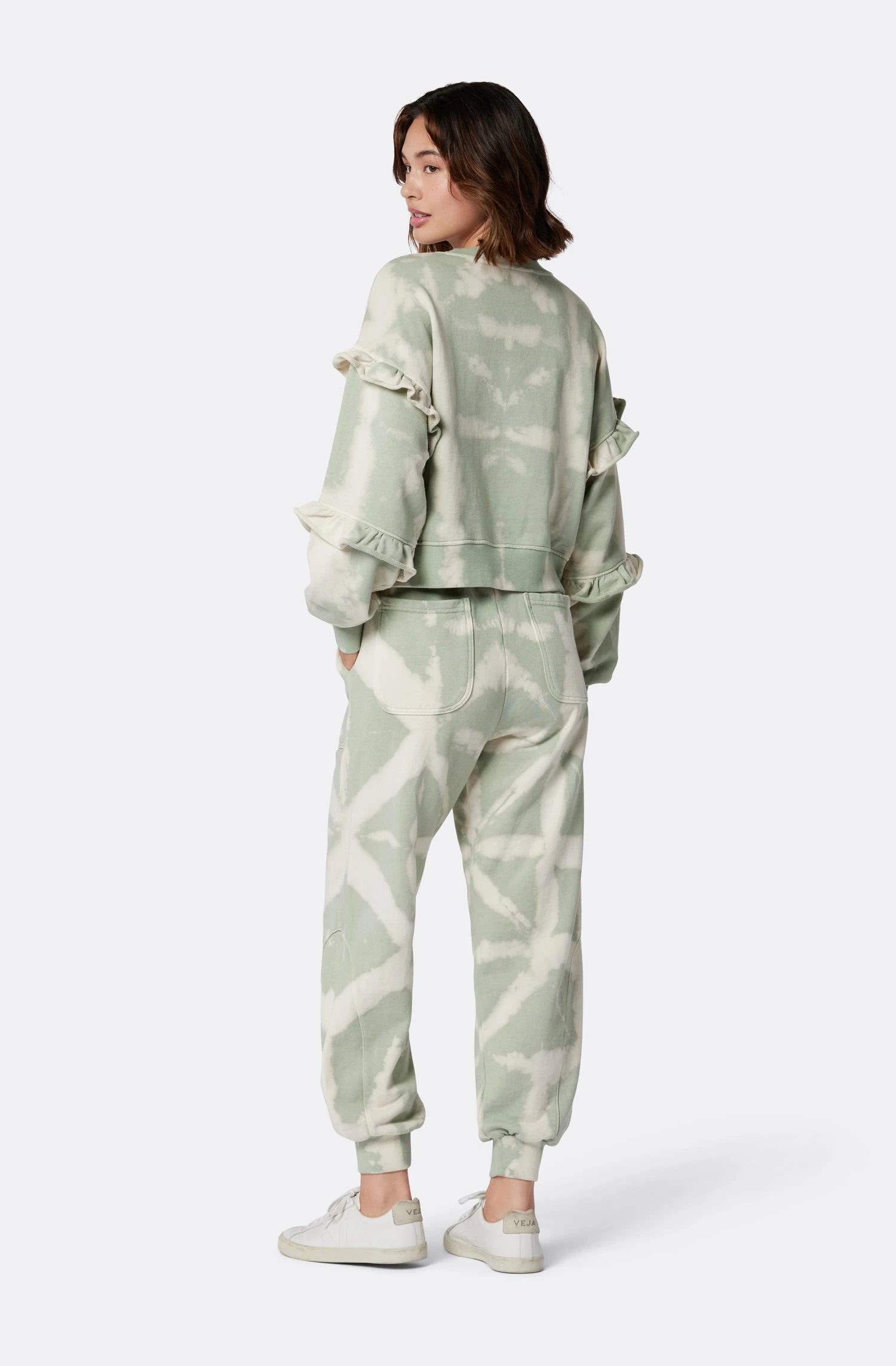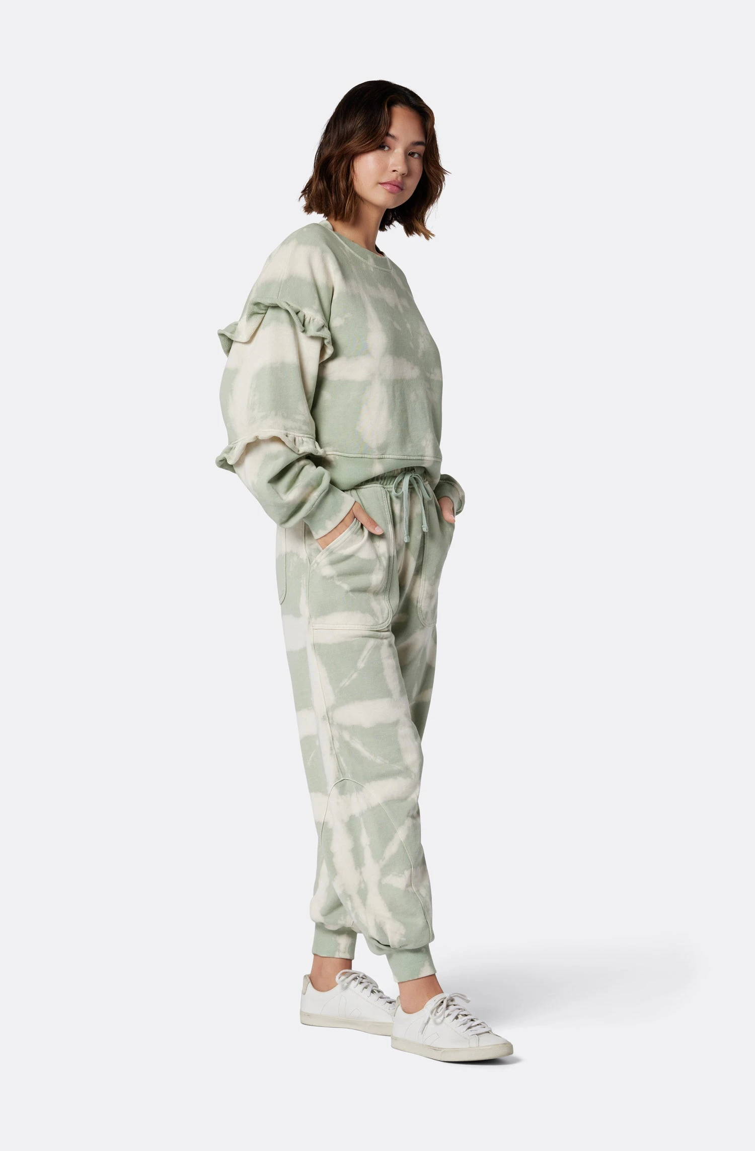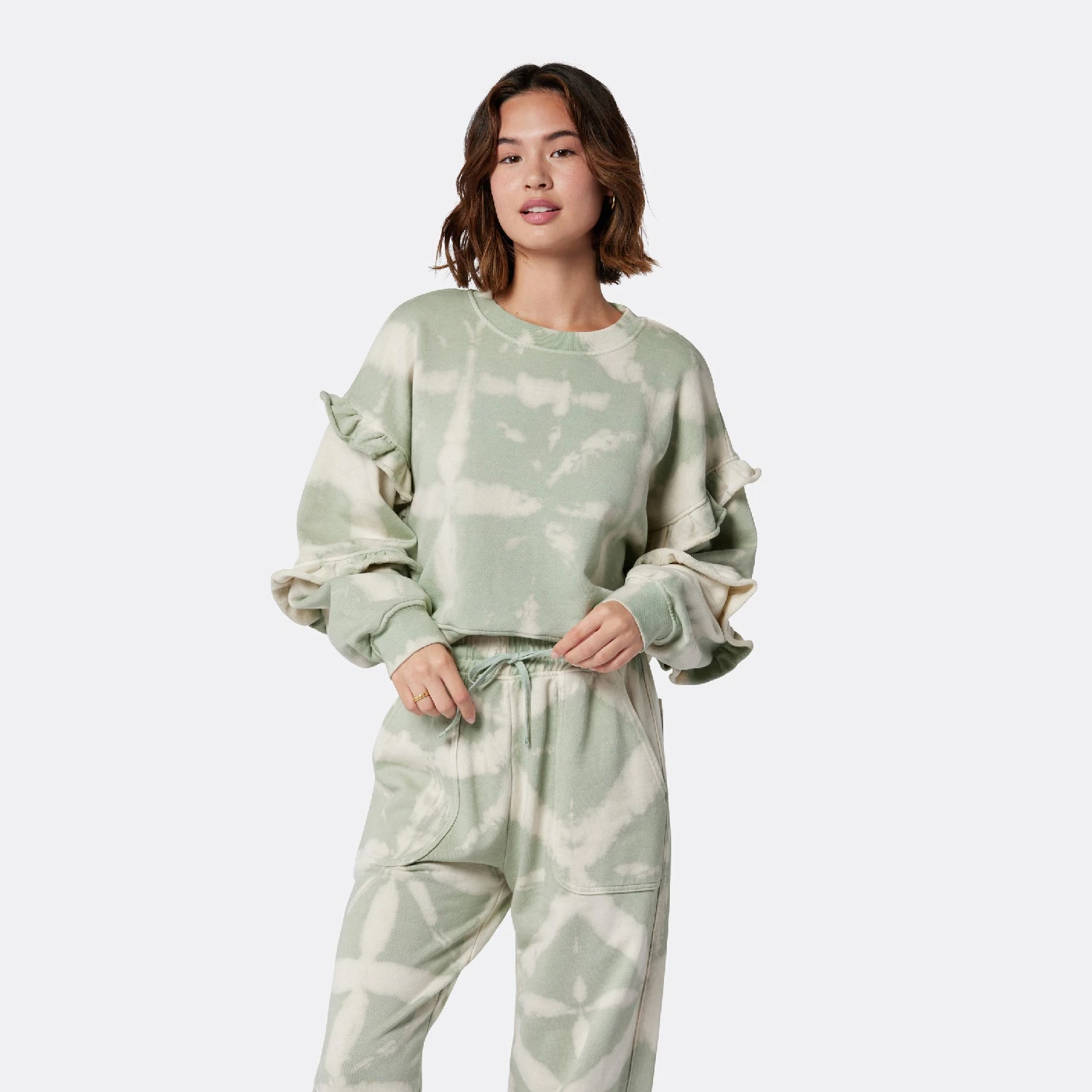 Slightly cropped with ruffles on the sleeves; The Camille B will make you rethink what sweatshirts can look like. Wear this French Terry design with its matching bottoms, The Witney, for an effortless monochromatic look.