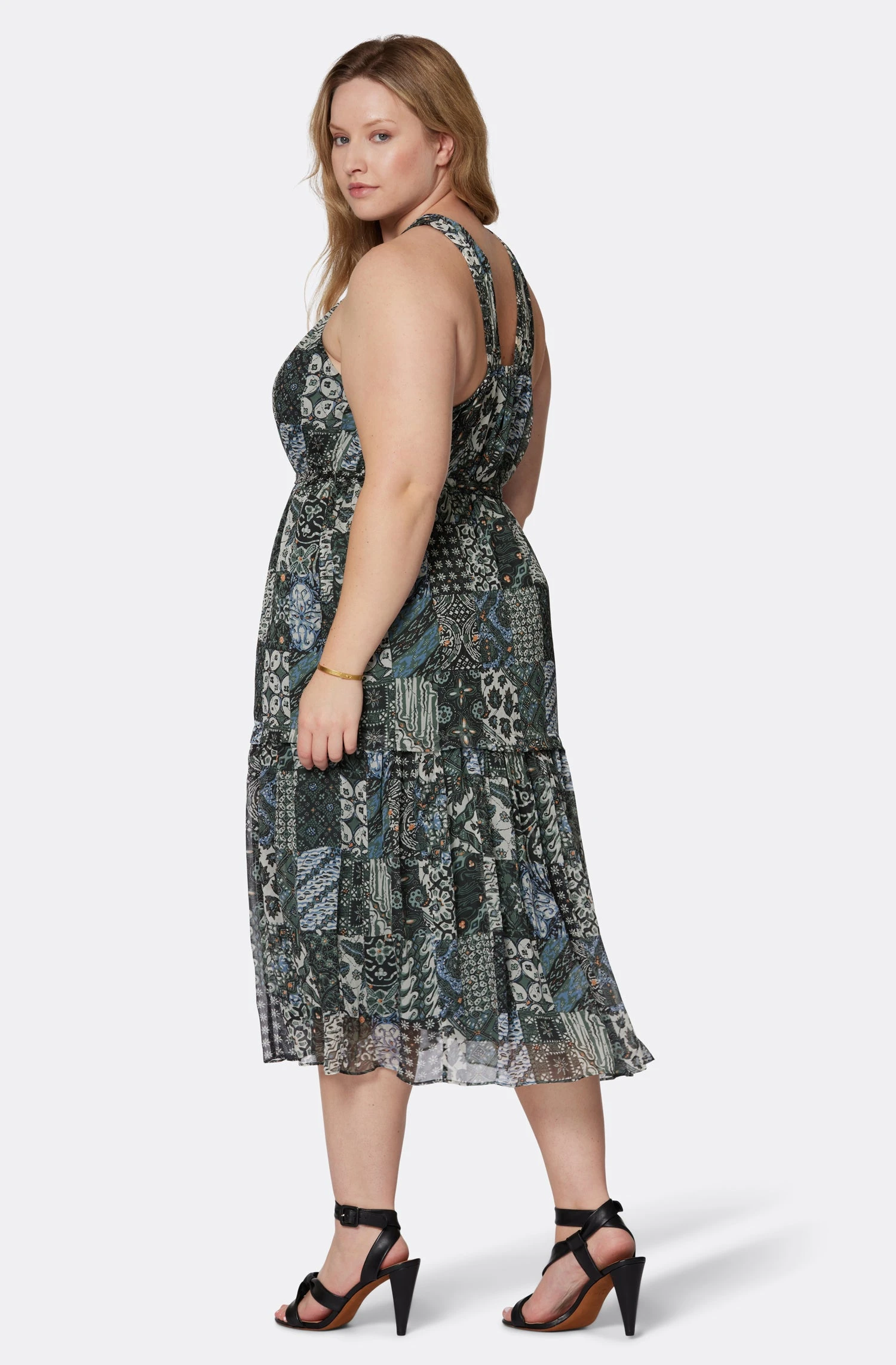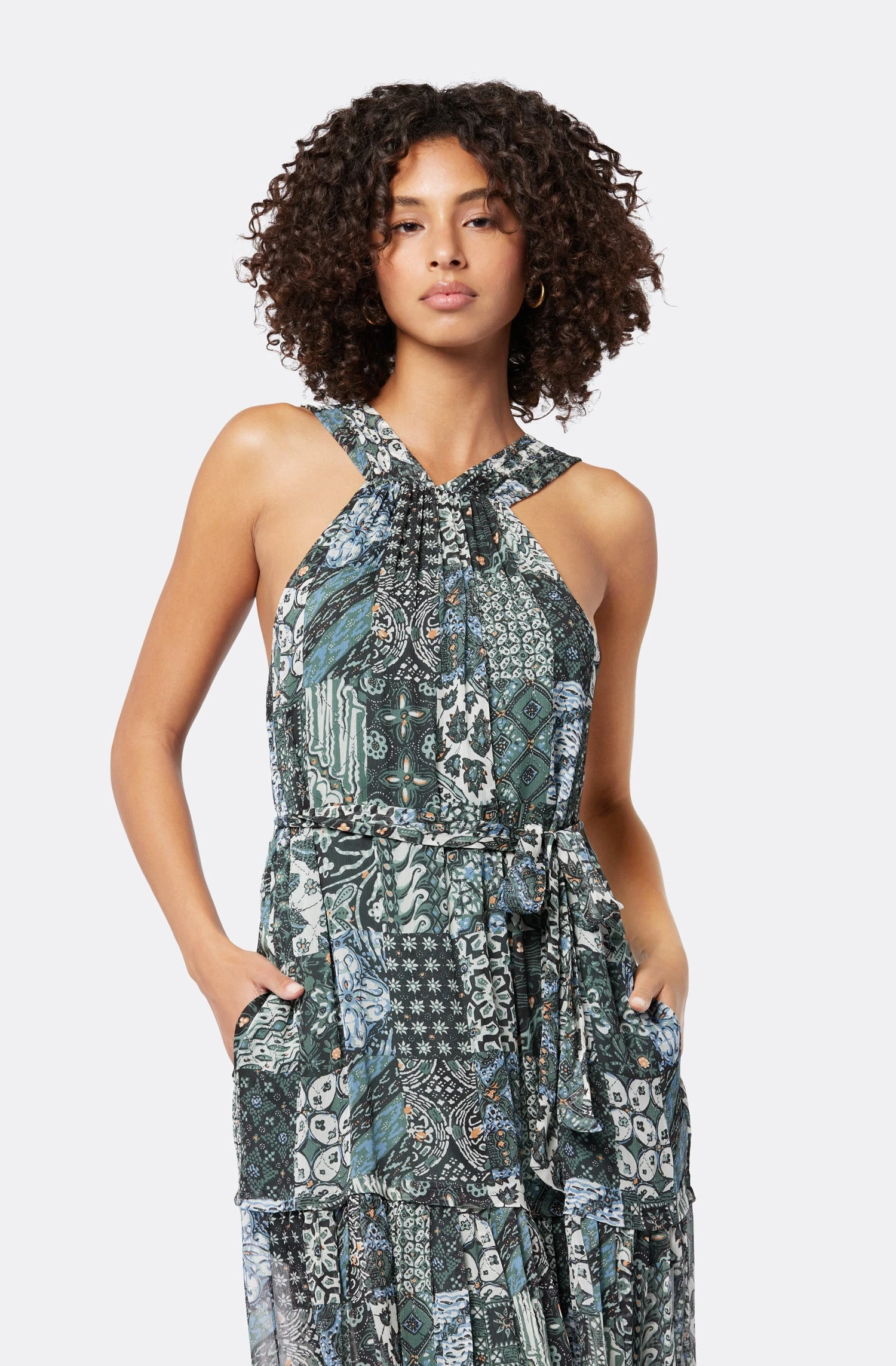 A halter neckline dress with a lot of flow to its silhouette; the perfect transitional piece that looks great on its own, or with a denim jacket for a spring layered look.