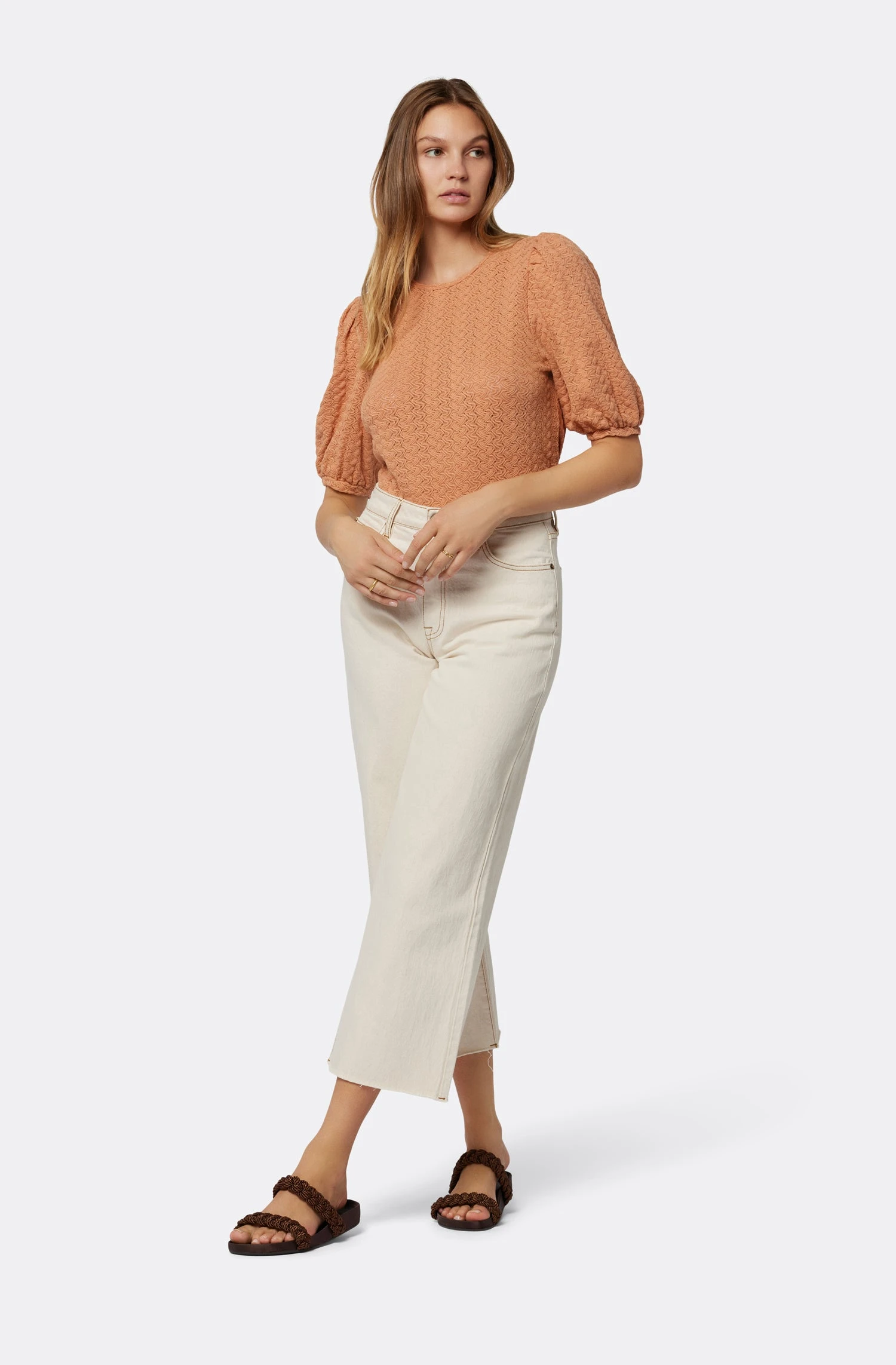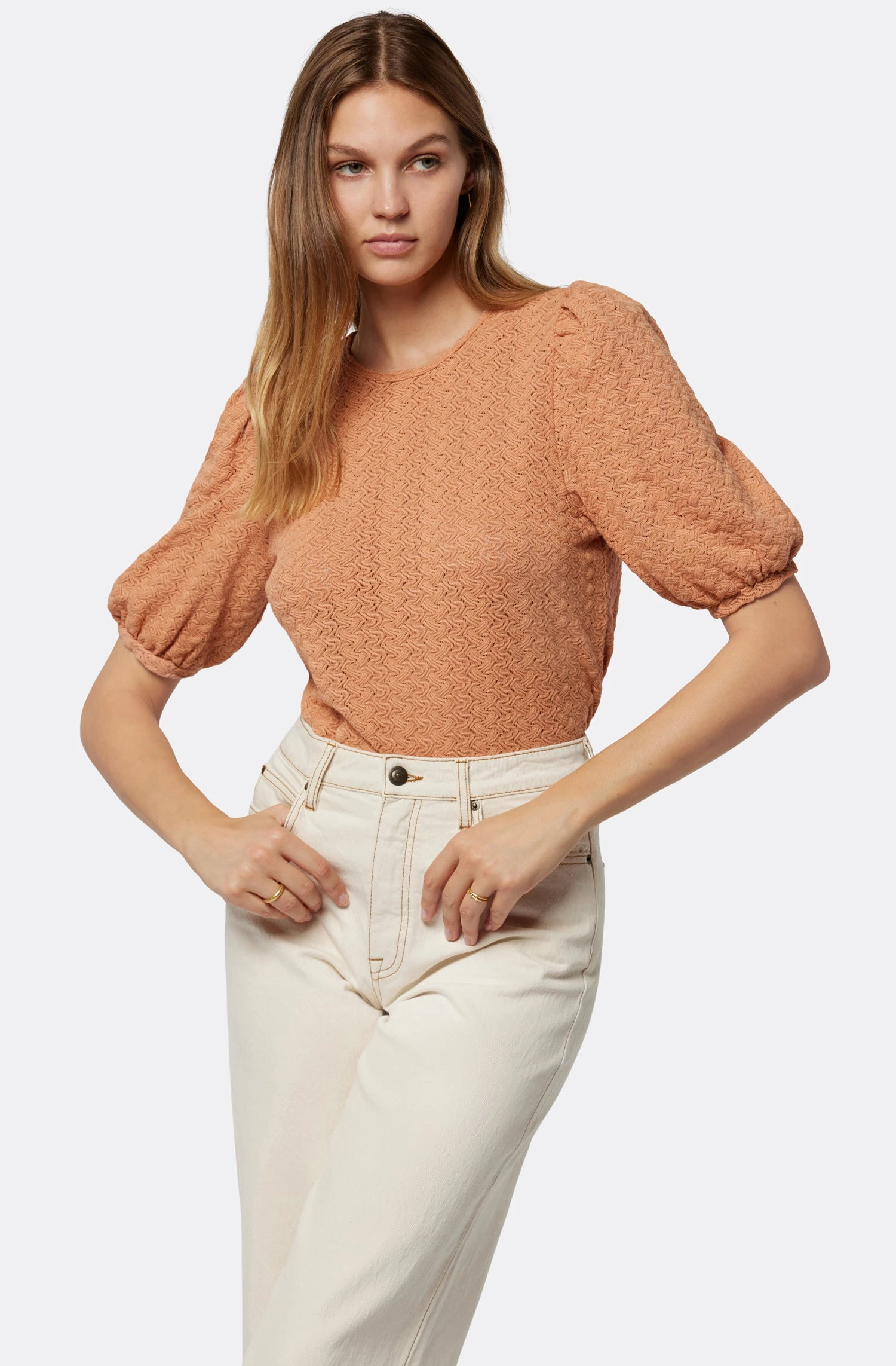 Voluminous sleeves, keyhole back details, and a slightly-cropped hem, The Jordie is not your typical everyday top. Wear this jacquard knit lace design with our denim to the office and look casually cool.