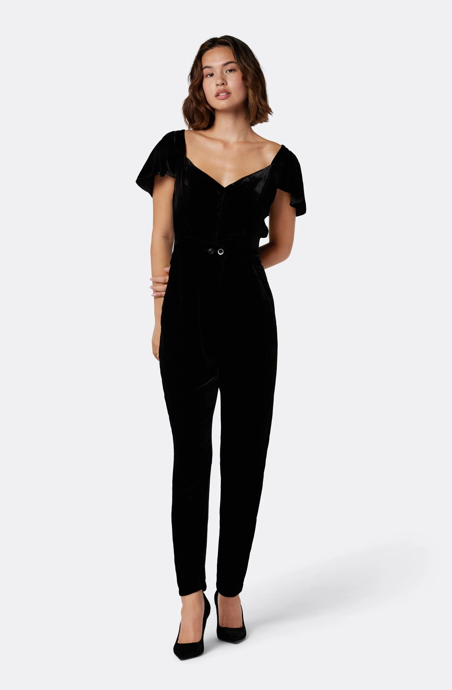 The Juniper is the embodiment of romance with its sweetheart neckline and exaggerated shoulders. This velvet design is slightly cropped and features a front button closure.