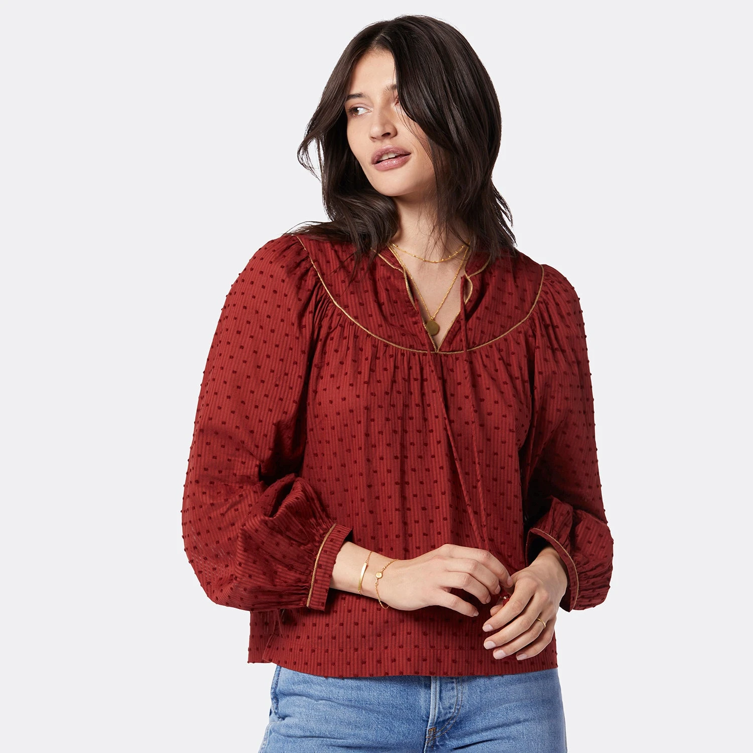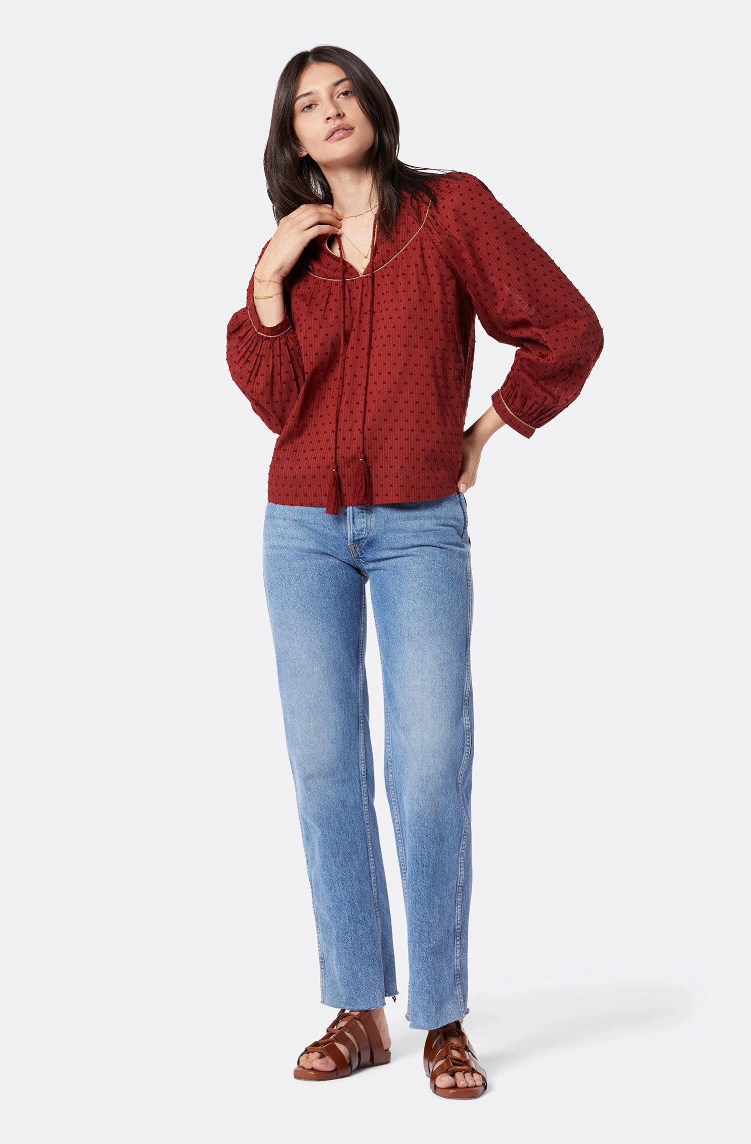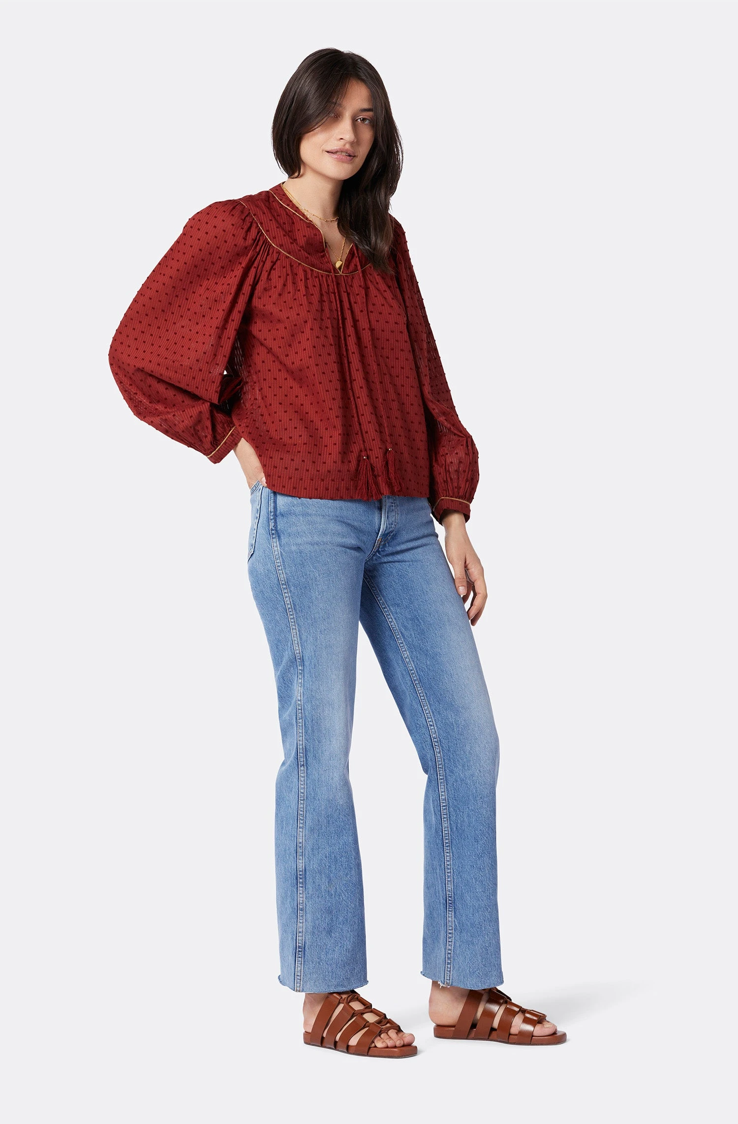 No subtleties here, The Keena makes quite the statement with slightly-voluminous sleeves, a smocked bodice, tassel strings around the neckline, and a unique print. We’re all about the details, and this cotton top features hand-stitched finishes around the neckline and cuffs.