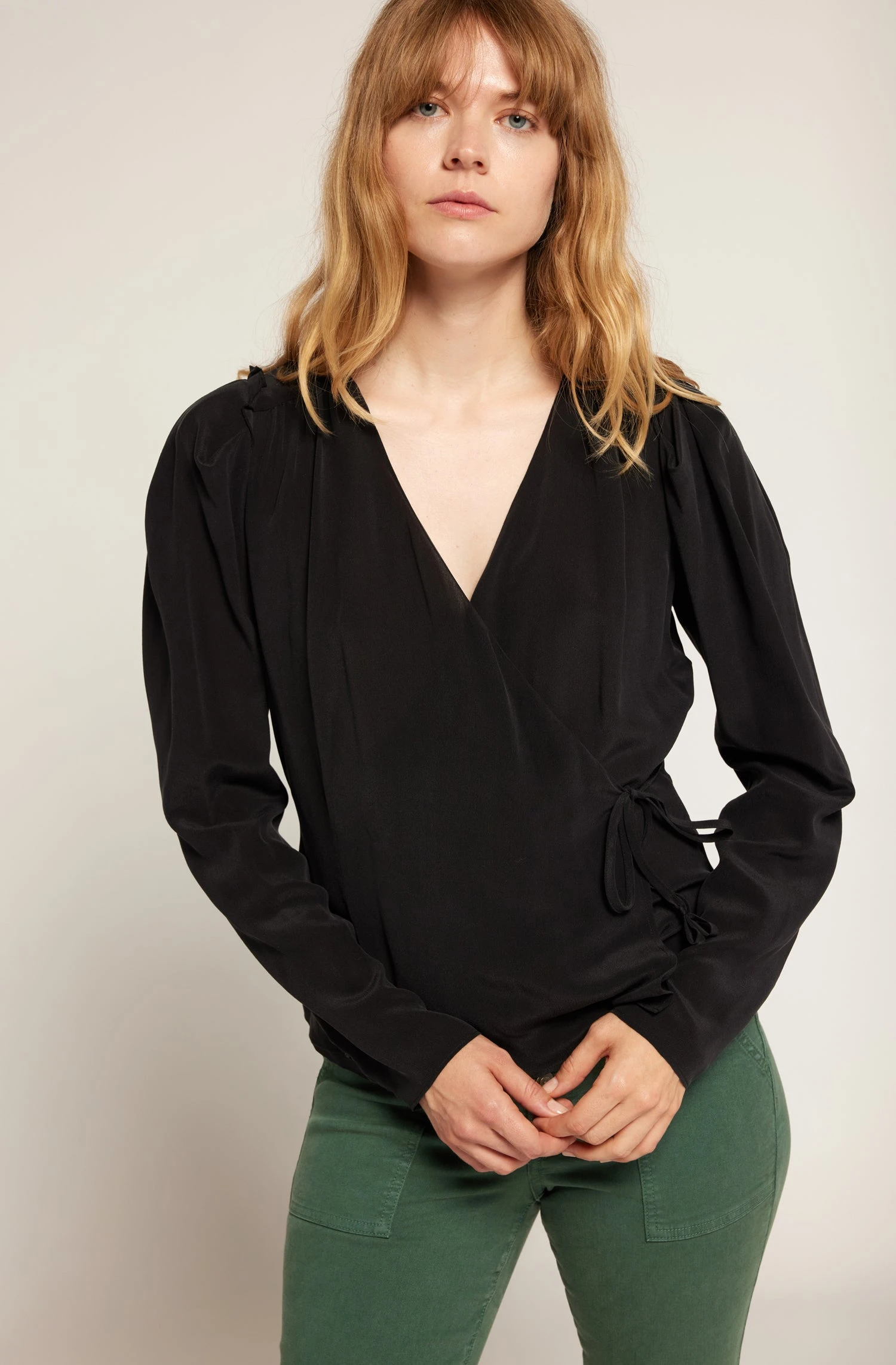 The Leigh is your quintessential wrap shirt of the season. Cut in luminous silk, this design can go from day to night with the right bottom and shoes.