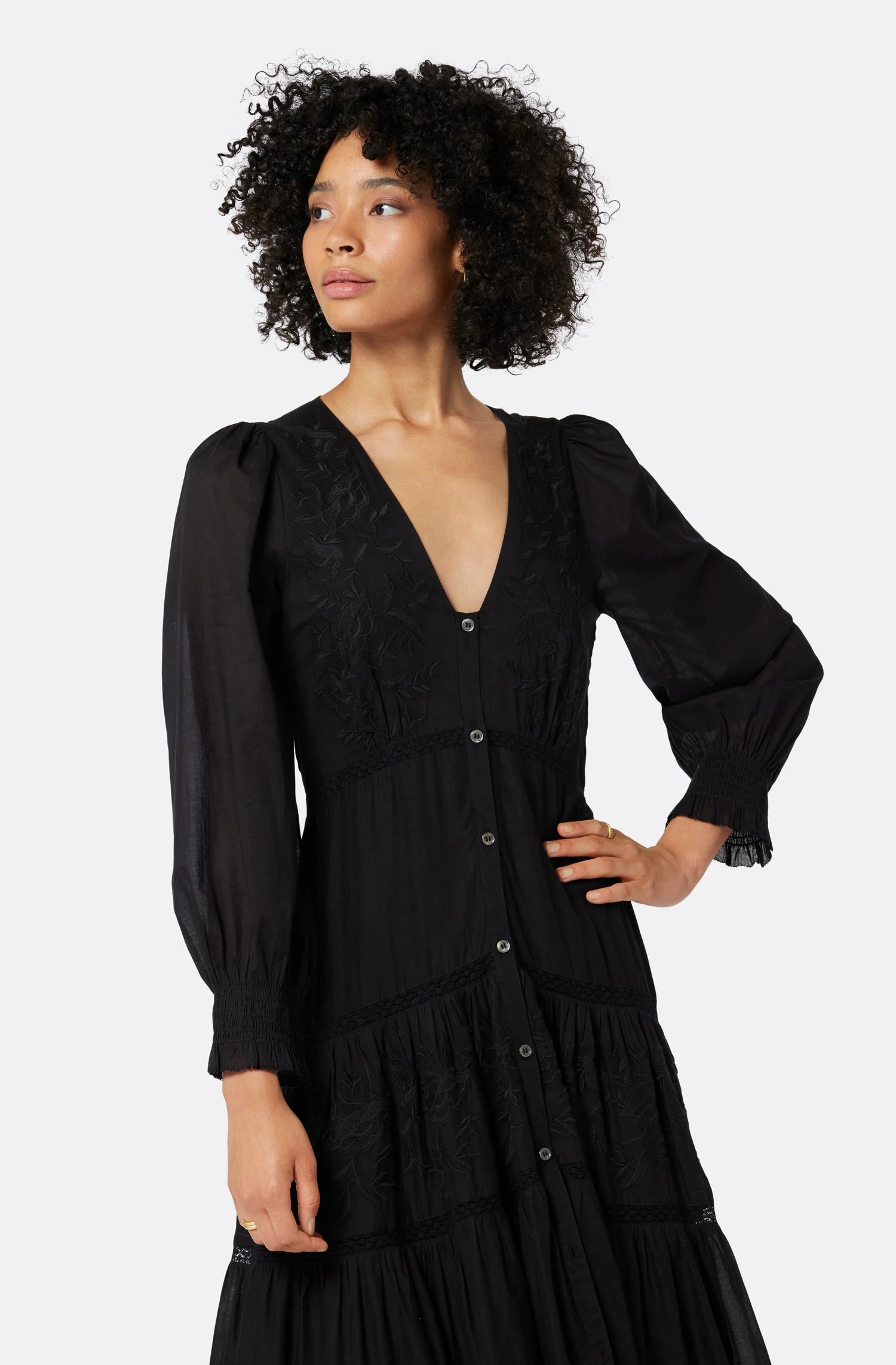 The Meredine brings a sort of vintage French fantasy with its carefree silhouette, deep V-neckline, and romantic sleeves. This tiered design levels up your dress collection and can be paired down or elevated with the right shoes and accessories.