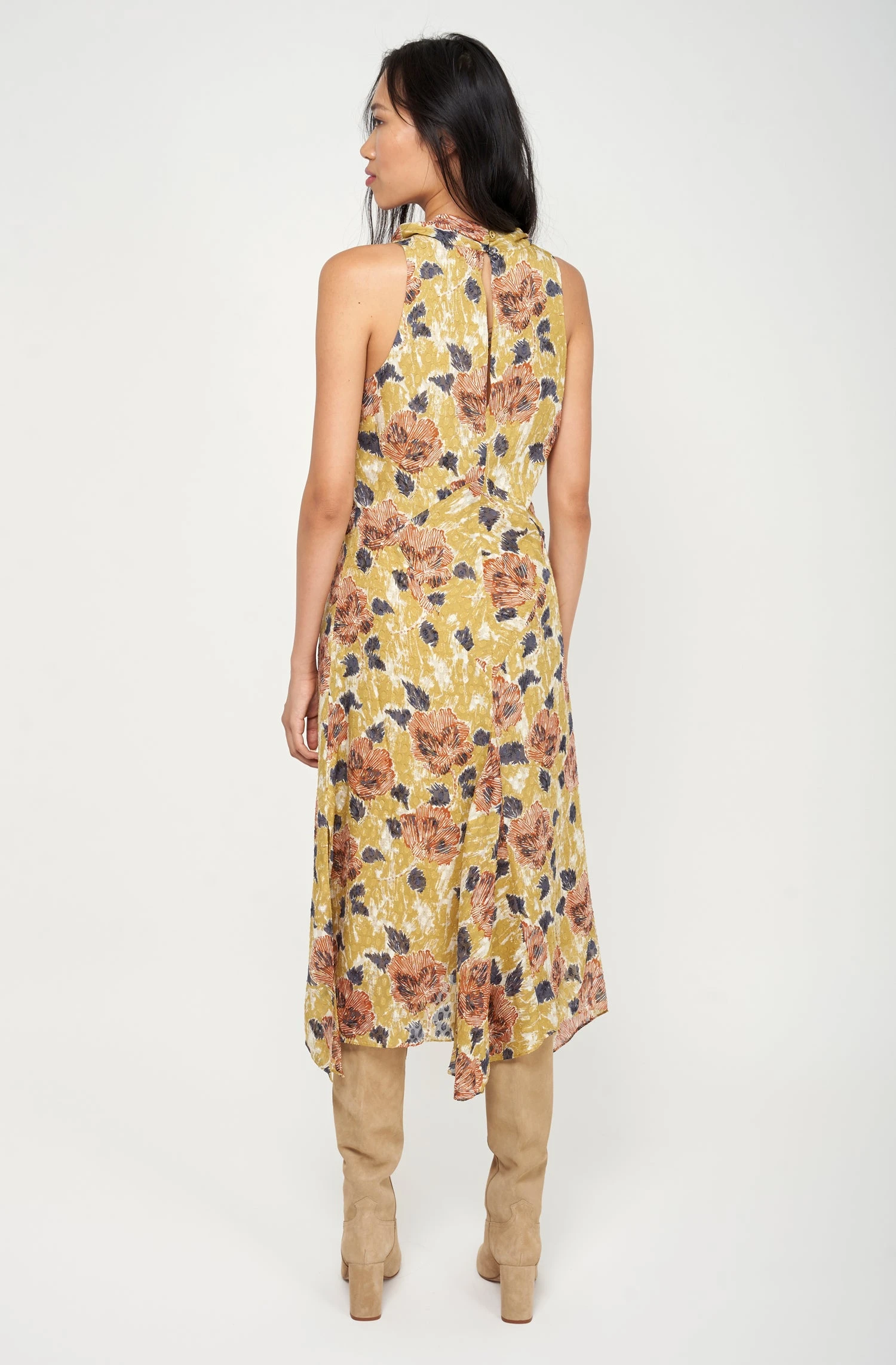 Capture comfort and style effortlessly in our halter neckline dress with a flowing silhouette. The Minnie also features a back keyhole detail and an asymmetrical hemline that adds a touch of playfulness to the overall design.